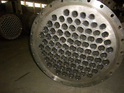 列管式换热器(冷凝器):列管式(又称管壳式) 换热器主要有壳体、管束、管板和封头等部分组成,壳体多呈圆形,内部装有平行管束或者螺旋管,管束两端固定于管板上。在列管式换热器内进行换热的两种流体,一种在管内流动,其行程称为管程;一种在管外流动,其行程称为壳程。管束的壁面即为传热面。管子的型号不一,过程一般为直径16mm 20mm或者25mm三个型号,管壁厚度一般为1mm,1.5mm,2mm以及2.5mm。材质多为304或316L。